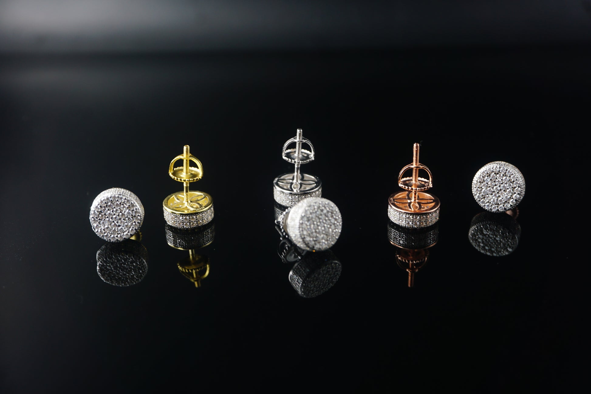These pavé moissanite stud earrings feature a bold rounded design that gives extra depth and dimension. Each piece is set with sparkling Moissanite stones that catch the light from every angle, delivering both brilliance and a unique shape you won’t find in standard studs.